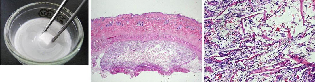 β-TCPナノ微粒子を配合したスキャフォールドをラットの皮下組織へ埋植する実験を行いました.細胞や血管が早期から大量にコラーゲン内部へ入り込んでいる(イングロース)ことを観察しました.つまりナノ微粒子の添加はコラーゲン材料の様々な活性を向上させることが明らかとなりました.本研究は2017年のDental Materials Journalに掲載されました.