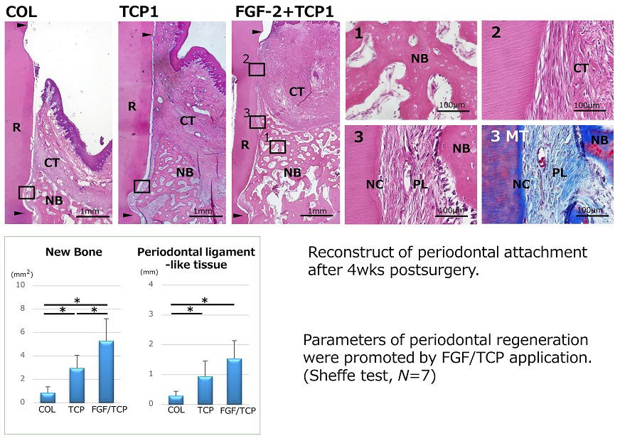 β-TCPナノ微粒子配合スキャフォールドを用いてイヌ実験的歯周炎モデル(1壁性)の再生実験を行いました.下図のようにスキャフォールドは歯周組織再生を促進することが明らかになり,さらに歯周組織再生薬リグロスの主成分である線維芽細胞増殖因子FGF2を併用すると,再生量が大幅に増加しました.本研究は2016年のJournal of Periodontal Researchに掲載されました.