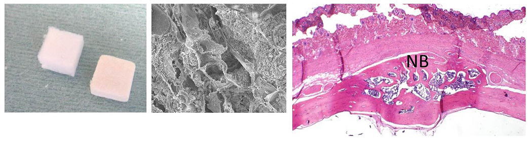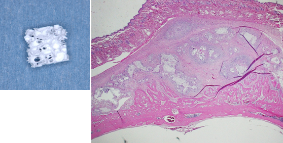 我々と東京大学古月研究室の共同研究チームは,リン酸カルシウムを100ナノメートル程度に粉砕・微粒子化してコラーゲン足場材料(スキャフォールド)に配合し,様々な生体活性(バイオアクティビティ)を向上させることに成功しました.ナノ微粒子は吸収が早く,タンパク吸着やマクロファージ出現を向上させ,歯周組織再生のためのバイオマテリアルとして優れた特性を有すると考えられます.下図のβ-TCPナノ微粒子をコラーゲン足場材に配合した再生用材料は,ラット頭蓋の骨再生を引き起こしました.本研究は2013年の Journal of Nanomaterialsに掲載されました.