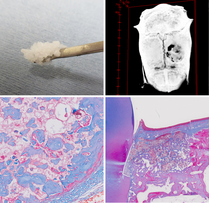 リコンビナントヒトコラーゲン様ペプチド(RCP)は,遺伝子工学によって生み出され動物由来成分を含まない,安心安全なバイオマテリアルです(富士フイルムHP).我々はRCPを用いて顆粒状の骨補填材を作製し,さらにβ-TCPナノ微粒子を配合して,ラットの頭蓋骨欠損部への埋植実験を行いました.RCP-β-TCPは大変強い骨形成能を示しました.またイヌ歯周組織欠損モデルに埋植すると,歯槽骨の再生とともに歯根膜の形成を認め,歯周組織再生材料としてのポテンシャルも確認できました.本研究は2020年のJ Biomed Mater Res Part B Appl Biomater,2023年のJ Oral Biosciに掲載されました.