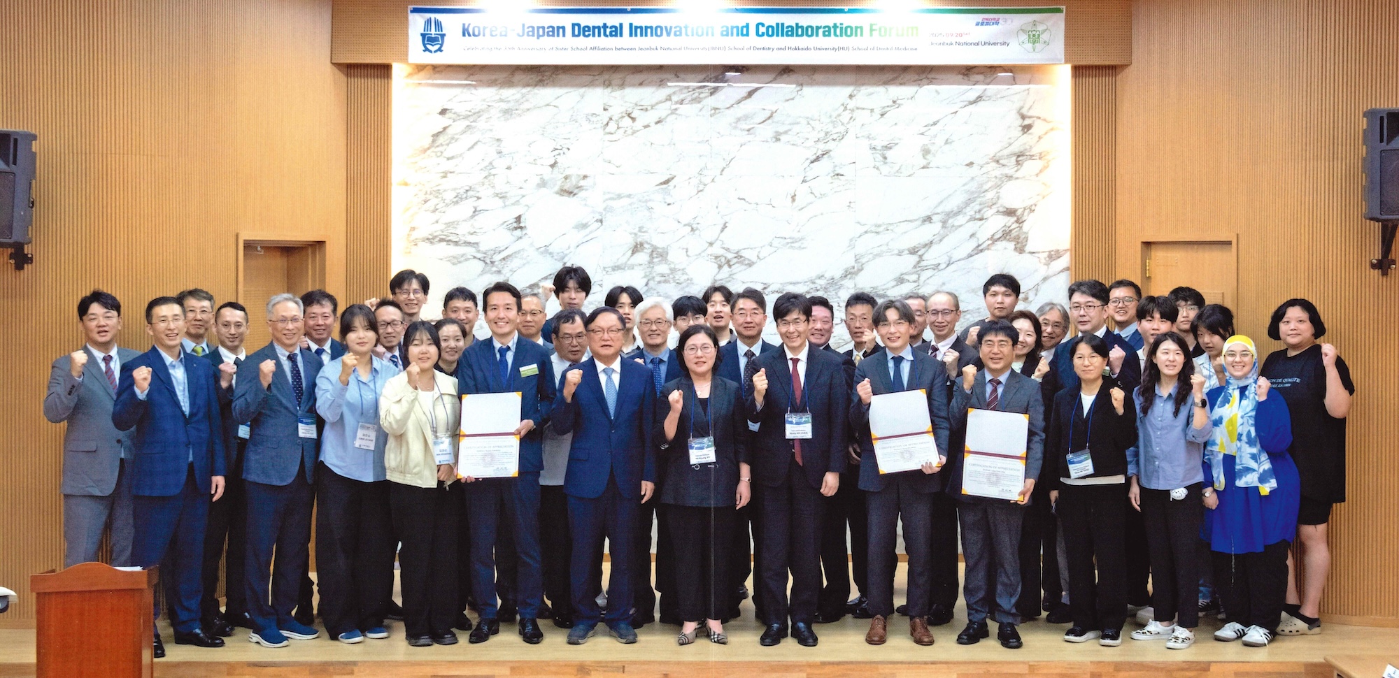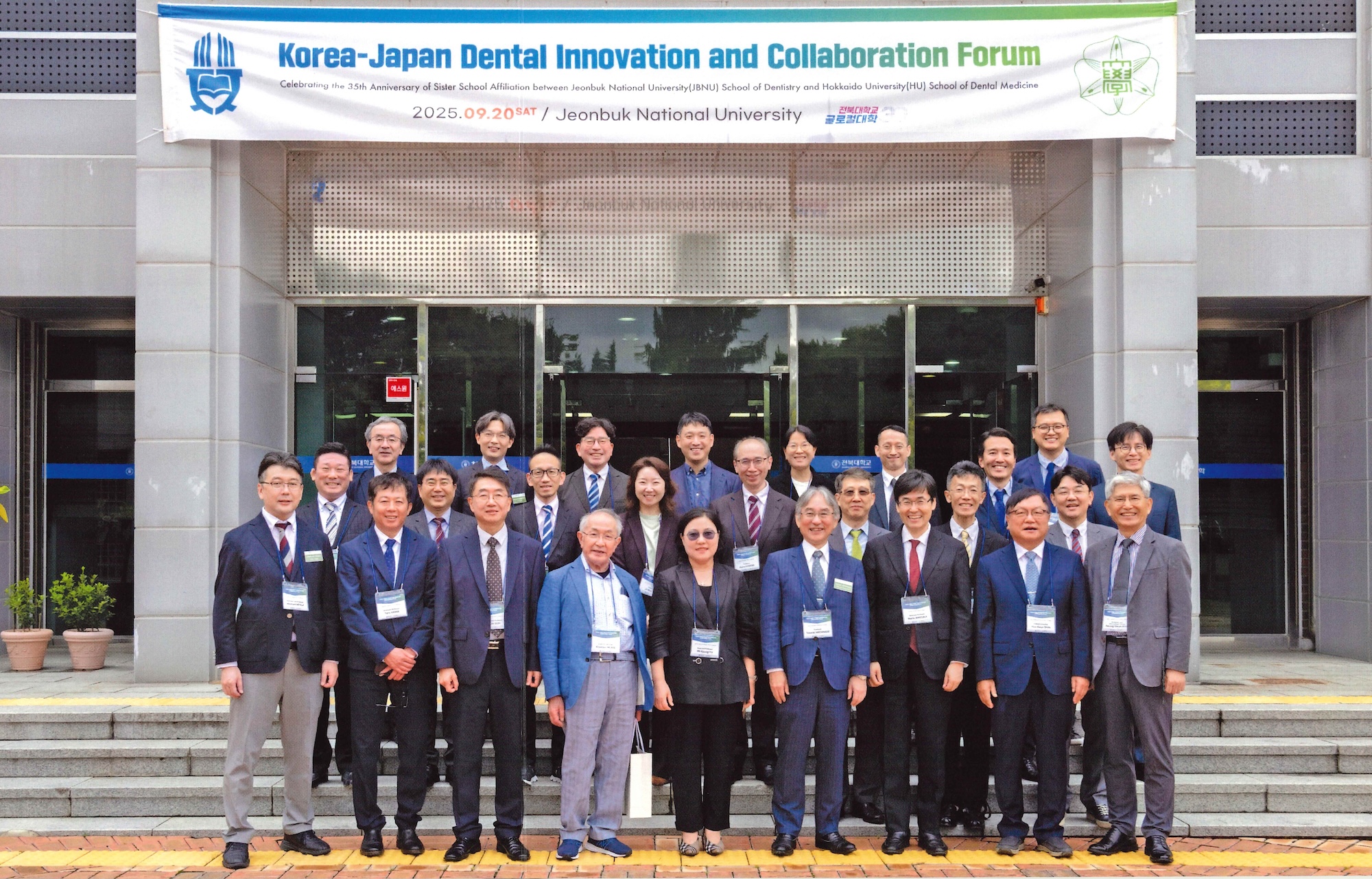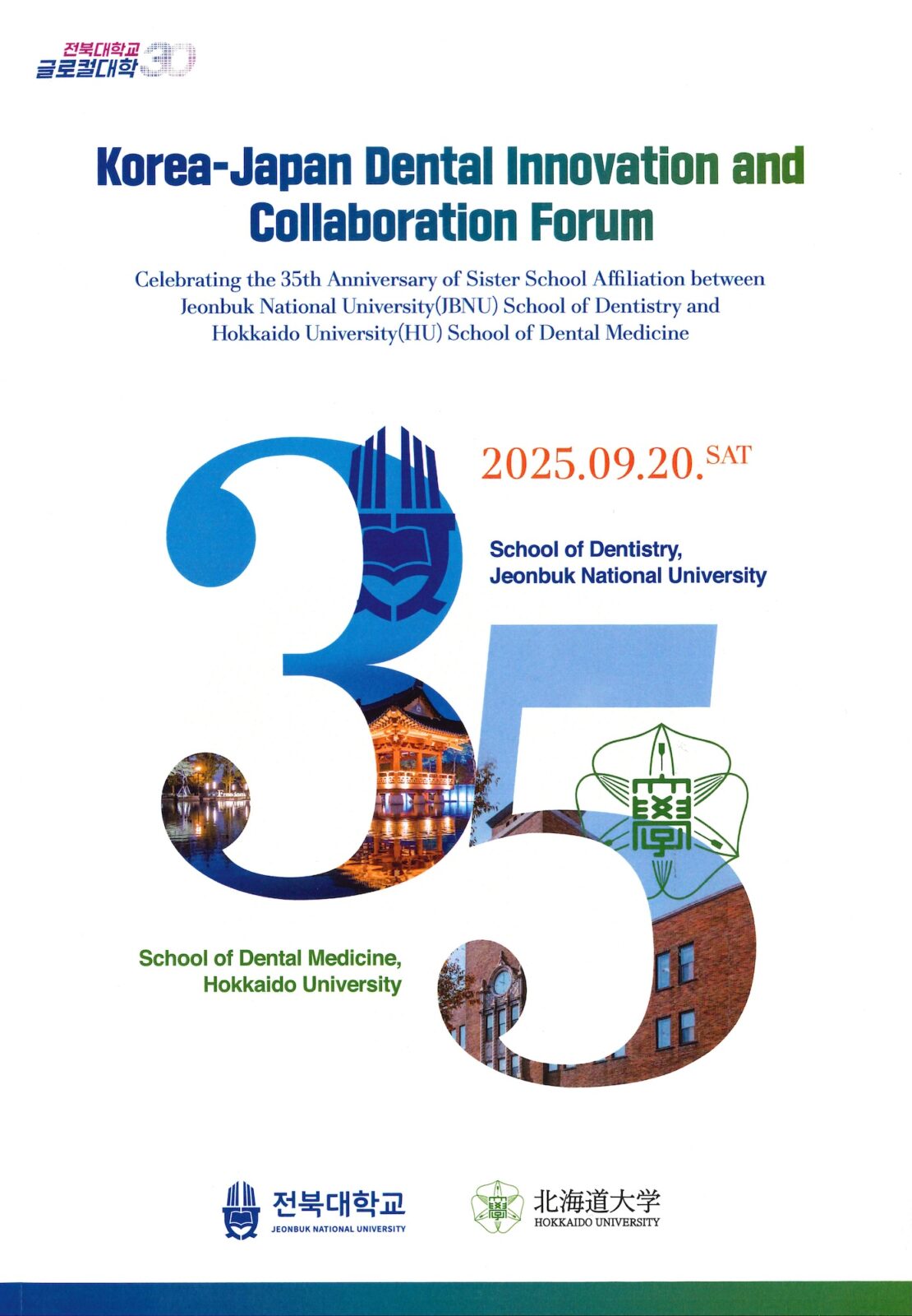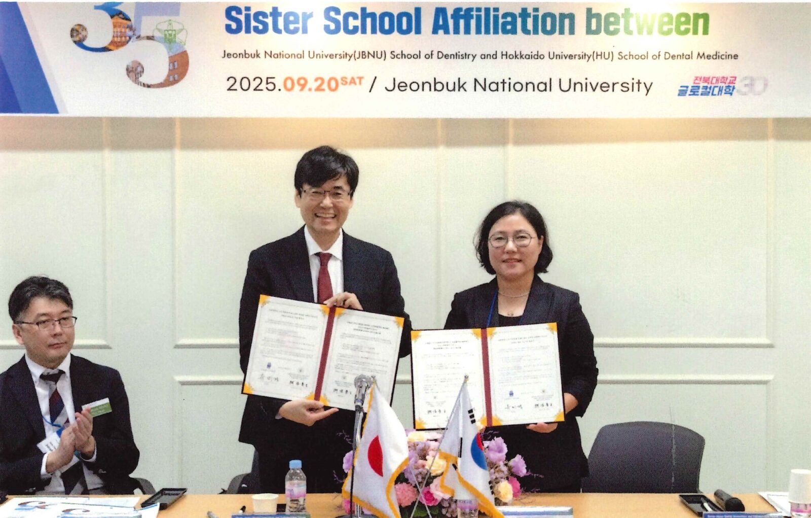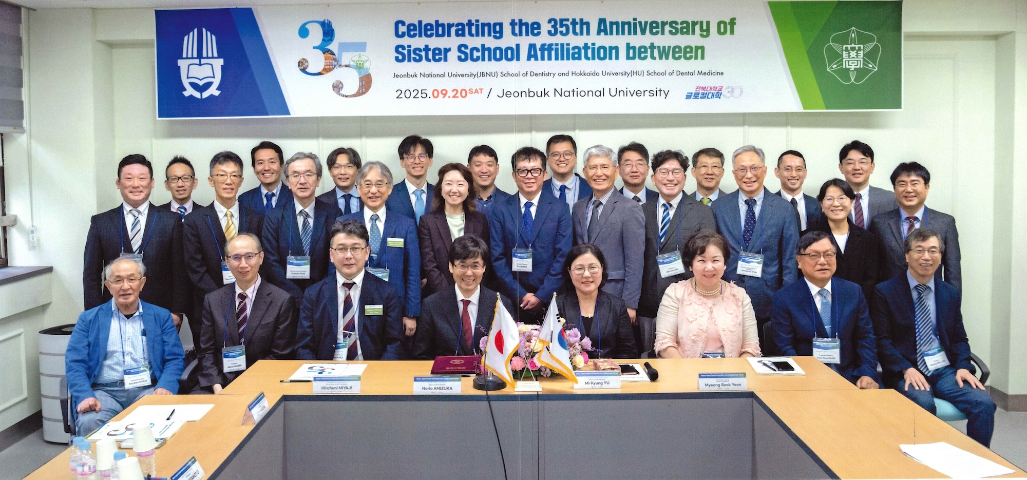 2025年9月20日、全北大学校において、全北大学校歯学部と北海道大学歯学研究院との姉妹校締結35周年記念事業を開催しました。北海道大学からは、網塚研究院長、宮治副研究院長、長谷部教授、宮本教授、友清教授、黒嶋教授、李教授、有馬准教授のほか、歯学部同窓会より渡邊同窓会長、村井元会長、井谷専務、沢村専務、中村先生を含む計13名が参加しました。一方、全北大学校からは、Mi-Kyung Yu歯学部長、Bong-Jik Suh前学部長、Seung-Geun Ahn元学部長、Hyo-Keun Shin元学部長をはじめ、長年にわたり全北大学校と北海道大学との架け橋としてご尽力いただいてきたTae-Sung Bae教授を含む、主要メンバー15名の教員にご参加いただきました。さらに、全北大学校歯学部同窓会からは、Yong Keun Lee会長をはじめ、多くの同窓生の皆様にもご出席いただきました。